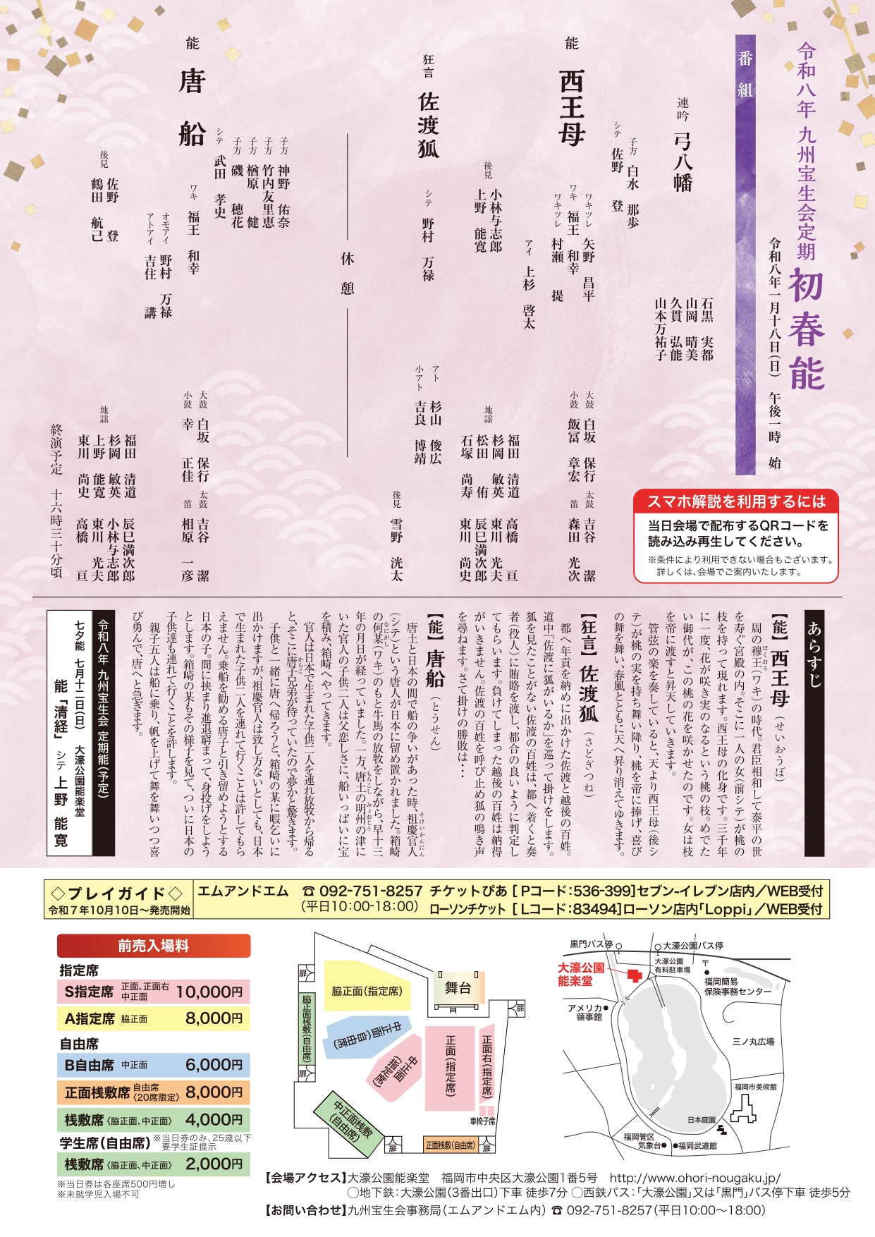 ■日時 2026年1月18日(日)13:00開演[12:30開場] ■会場 大濠公園能楽堂(福岡市中央区大濠公園1-5) ■料金 <指定席> S指定席 10,000円(正面・中正面・正面右椅子席) A指定席 8,000円(脇正面椅子席) <自由席> B自由席 6,000円(中正面椅子席) 正面桟敷席 8,000円 脇正面・中正面桟敷席 4,000円 学生席 2,000円(脇正面・中正面桟敷席) ※当日券は500円UP ※学生席=当日券(2,000円)のみ/小学生~大学生/25歳以下 ※未就学児のご入場はできません。 ■プログラム